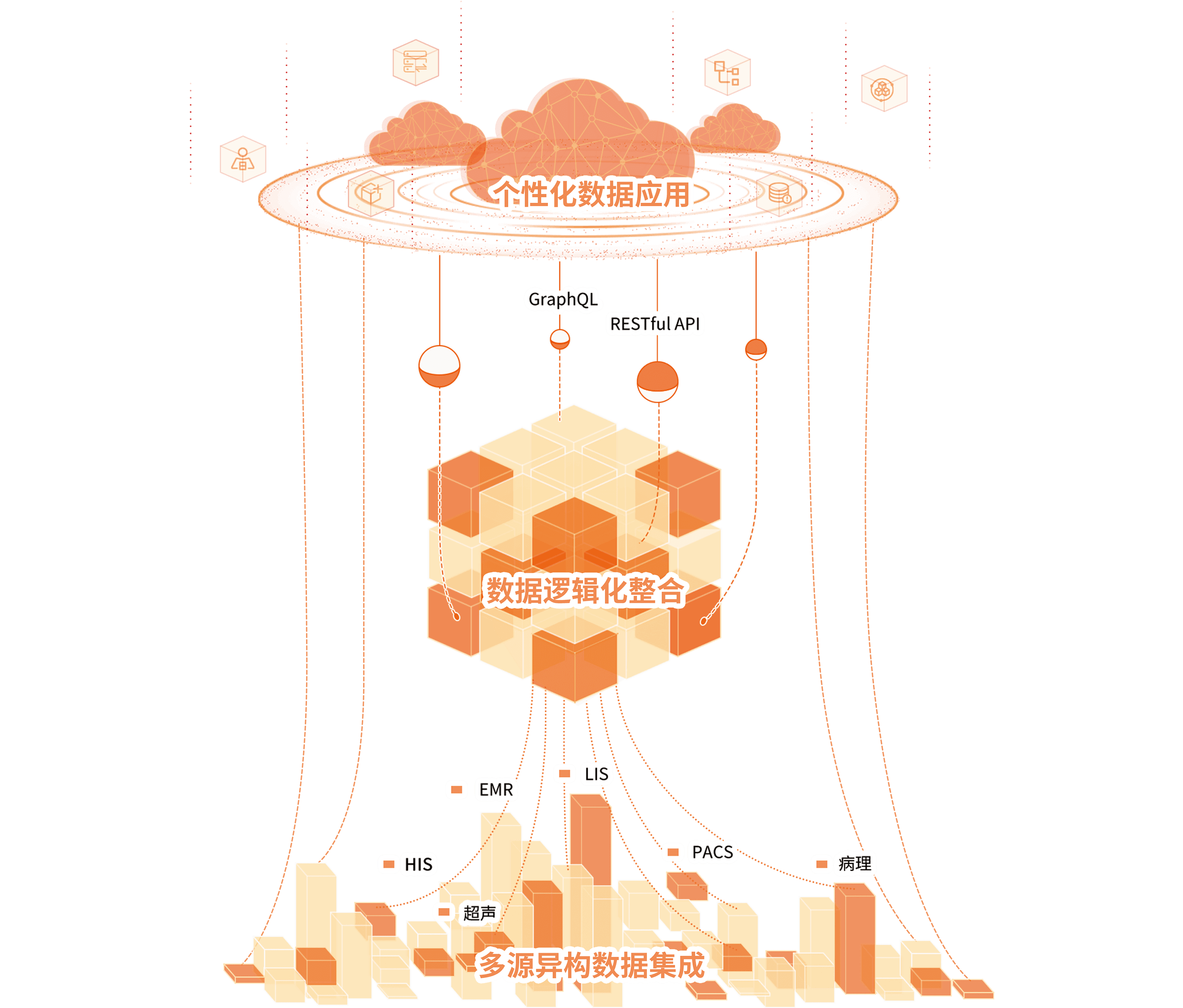 醫(yī)眾醫(yī)療數(shù)據(jù)服務(wù)采用 Data Fabric 數(shù)據(jù)編織的架構(gòu)理念,幫助用戶應(yīng)對在數(shù)據(jù)資產(chǎn)化進程中產(chǎn)生的復雜性、分布式、多元化等因素,從單純的以數(shù)據(jù)應(yīng)用為核心建設(shè)數(shù)字化,向體系化的數(shù)據(jù)服務(wù)能力建設(shè)轉(zhuǎn)型。